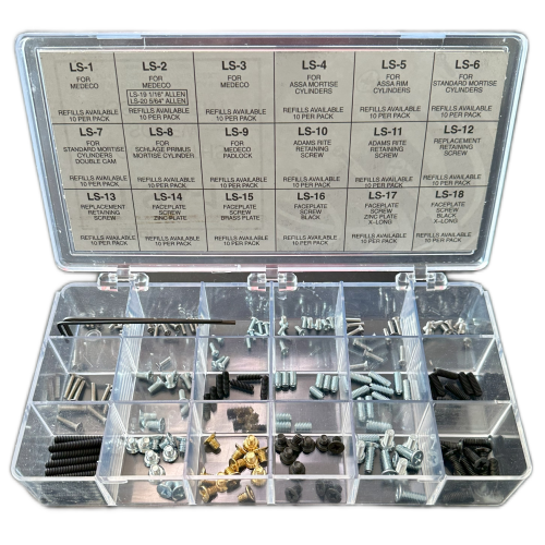 Overview: The Major LSA-1 ia an assortment containing 18 of the most commonly used and misplaced screws that are required when servicing locks. The LSA-1 kit contains mortise cylinder cam screws, cylinder set screws, face plate screws and others than can be missing or lost when on the job. Also included are the allen wrenches needed for the allen screws used in the kit. A handy assortment that will pay for itself the first time that its used. Refills are available in packs of 10.